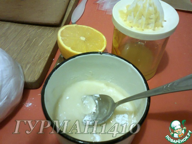 53. Готовим глазурь из сахарной пудры. В сахарную пудру наливаем понемножку сок лимона (у меня апельсиновый) и хорошо перемешиваем ложкой, добавляя сок до состояния густой смеси – чтобы глазурь не растекалась.