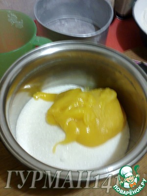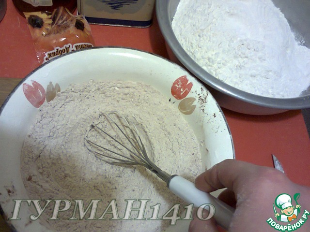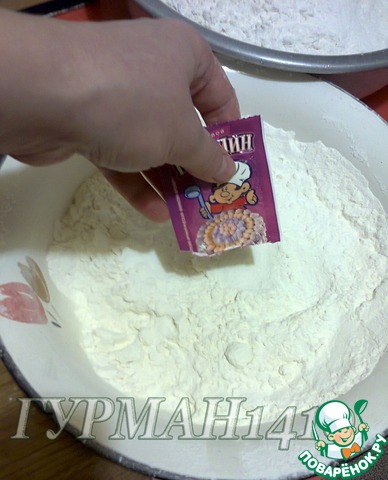 2. Муку разделить на 2 части. Половину муки отставить в сторону. В другую половину добавляем 2 чайные ложки разрыхлителя.