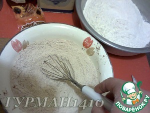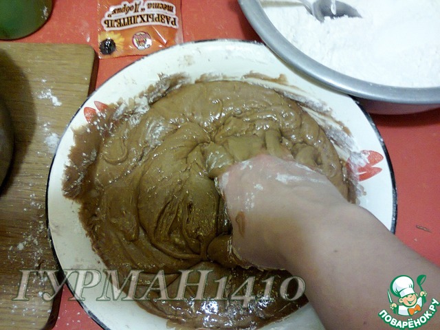 20. Добавляем понемногу муку с добавками и вымешиваем тесто руками, постепенно добавляя остальную муку. Обычно, муки уходит меньше, чем в рецепте.