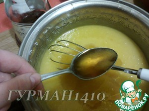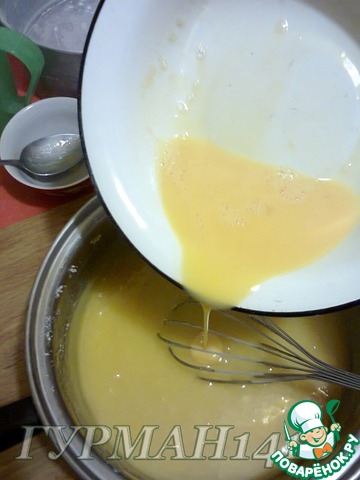 17. Медленно вливаем в медовую смесь половину размешанных яиц и быстро перемешиваем венчиком.