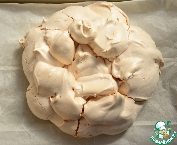 После выпечки оставляем меренгу остывать в духовке на час при открытой дверце. Перекладываем осторожно на плоскую тарелку. Меренга для Павлова необычна, у неё хрупкая, с трещинами, поверхность, а внутри – мягкое суфле. -