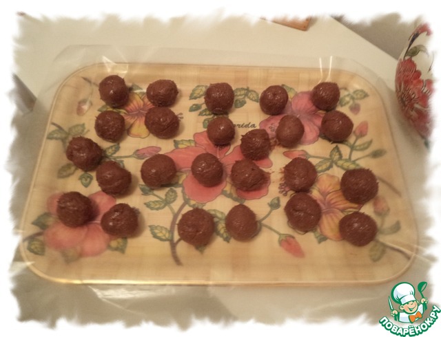 Посуду застелить бумагой для выпечки, катать шарики и складывать на бумагу. Поставить в морозилку на минут 20.