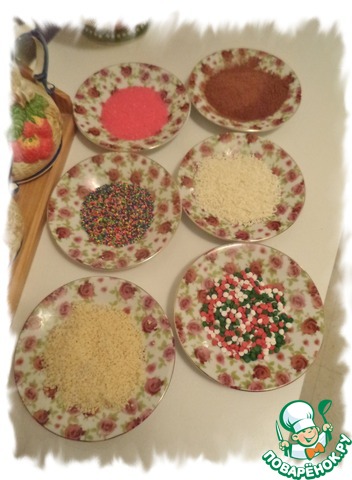 Подготовить различные посыпки. В данном случае у меня розовый сахар, какао, два вида разноцветных посыпок, белый тёртый шоколад и молотый миндаль. Но вы можете использовать любые на ваш вкус.