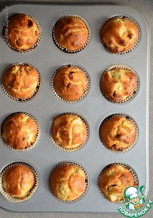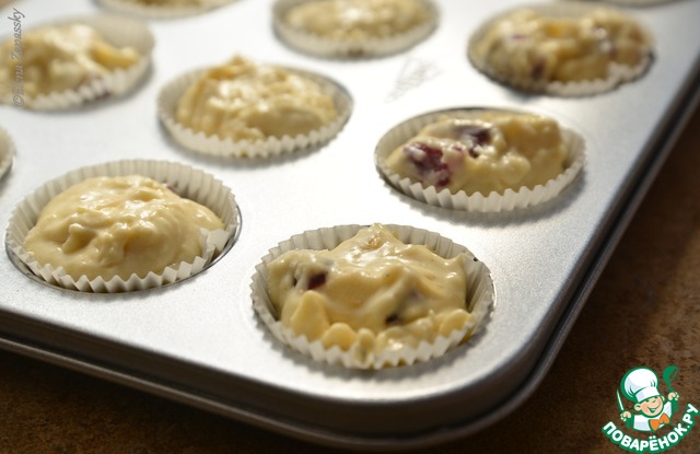 Ложкой накладываем тесто в бумажные формочки и ставим в горячую духовку. Время выпечки зависит от размера маффинов, 15-25 минут.