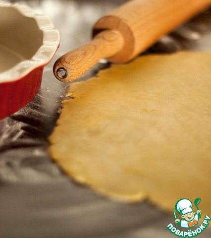 Слегка посыпьте мукой поверхность и раскатайте тесто толщиной 3 мм. Пласт теста должен быть на 5-6 см больше формы для выпечки. В процессе раскатывания периодически поворачивайте тесто на 90°, чтобы оно не прилипало к поверхности, подсыпая немного муки, если необходимо.