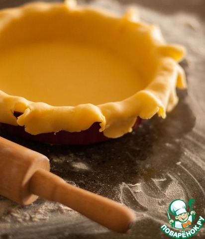 Перенесите тесто в форму, очень легко можно это сделать с помощью скалки. Посыпьте скалку мукой, намотайте на нее тесто и размотайте над формой. Прижмите тесто к краям, если они гофрированные, скалкой прокатите по поверхности несколько раз и затем уберите лишнее тесто по краям. Поставьте форму в холодильник на 20 минут, чтобы тесто не осело во время выпечки.