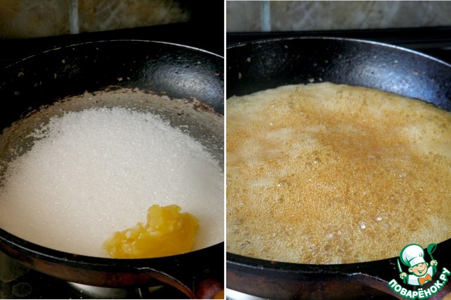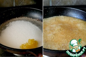 В сковороду с толстым дном всыпьте сахар и положите мед, поставьте на огонь. Не перемешивайте, пока сахар полностью не расплавится.