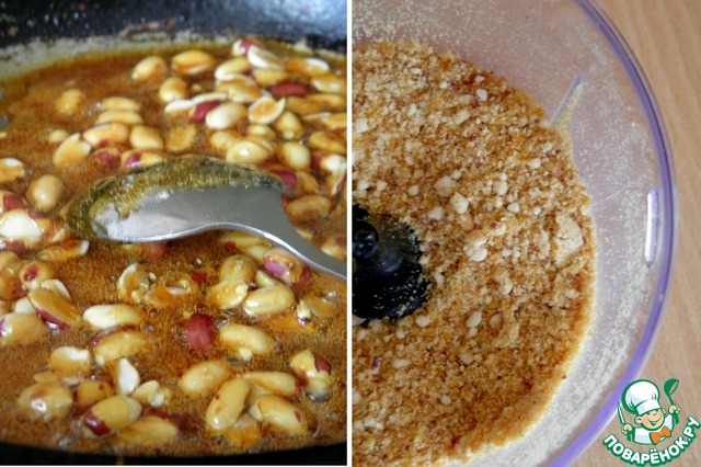 Как только сахар станет карамелью, быстро перемешайте и всыпьте обжаренные и чищеные орехи. Я взяла арахис. Перемешайте, выложите массу на пергамент и остудите.