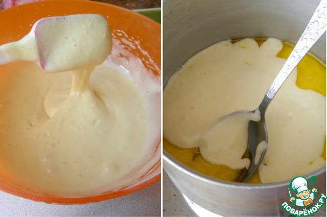 Несколько ложек теста добавить в подогретое молоко с маслом. Перемешать и влить в основное тесто. Снова аккуратно перемешать.