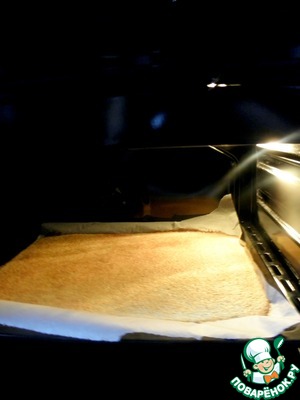Противень застелить пергаментом. Духовку разогреть до 180С. Выложить тесто на противень (у меня 40х30см) и выпекать около 15мин, но ориентируйтесь на свою духовку – у меня корж был готов через 9 мин. Не пересушите, бисквит может поломаться.