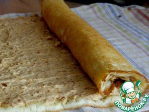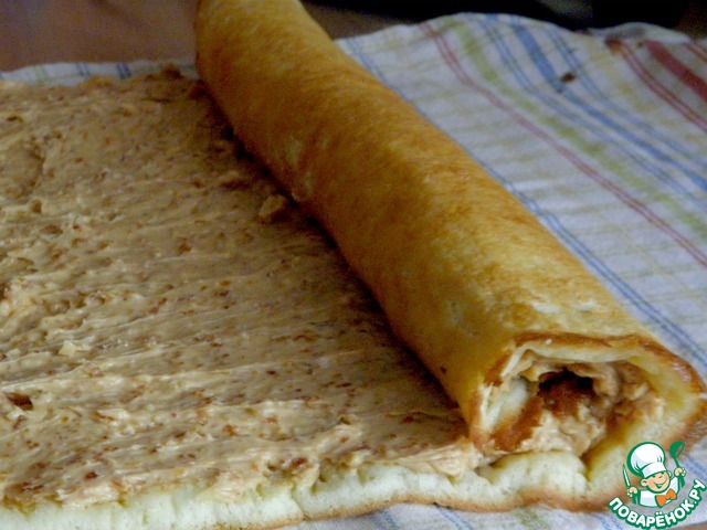 Готовый корж переворачиваем на полотенце, снимаем пергамент и сворачиваем в рулет. Даем остыть. Вообще автор пишет, что этот корж и в остывшем виде хорошо скручивается, но я решила не рисковать))