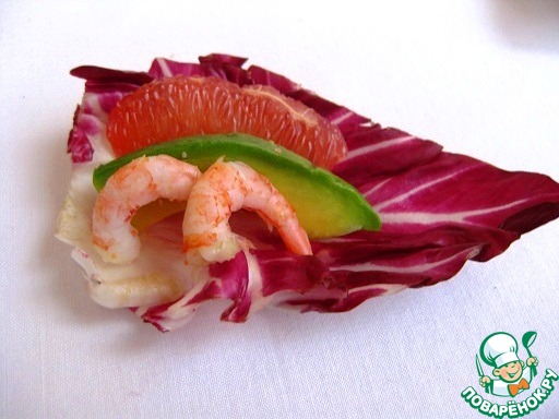 Укладываем на лист цикория по ломтику авокадо, кусочек грейпфрута и две-три креветки. Все, первая закуска готова.
