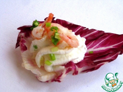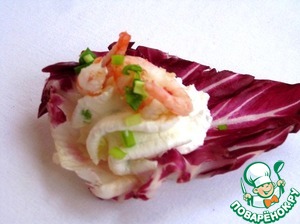 Выкладываем сырную массу на листы цикория, сверху кладем креветку.