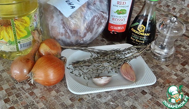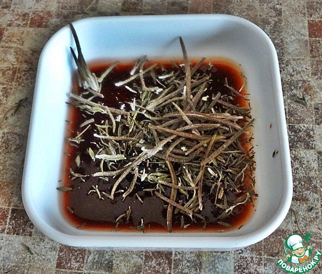 В чашке смешиваем соус Киккоман 4 ст. л., красный винный уксус 3 ст. л., чеснок, пропущенный через пресс, молотый чёрный перец, листочки тимьяна и розмарина. Кто любит азиатскую нотку, может добавить натёртый на мелкой тёрке корень имбиря. -