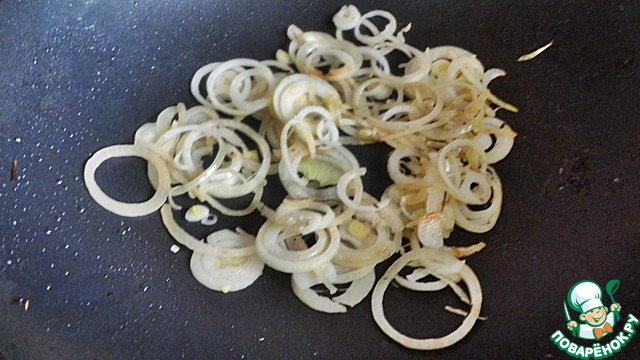 Поджариваем на сковороде на оставшемся масле лук, порезанный тонкими кольцами.