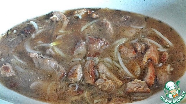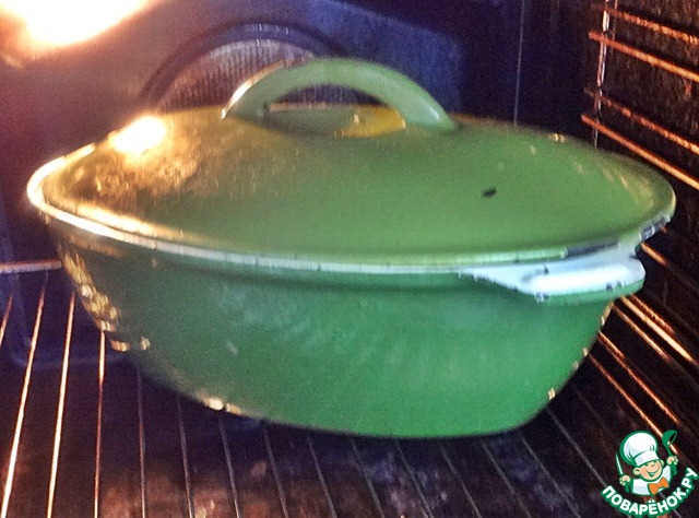 Нагреваем духовку до 100 гр. С, ставим нашу форму с мясом и "забываем" про него на 7-8 часов.