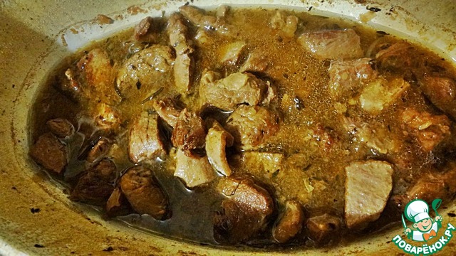 Когда жидкость от мяса выпарится, добавляем маринад, который мы приготовили с соевым соусом. немного подержим на огне и перекладываем в жаропрочную форму, с толстыми стенками. У меня была утятница.