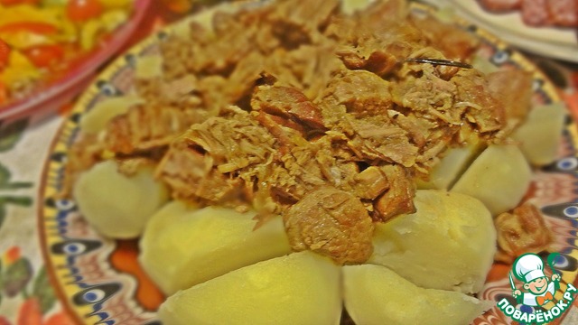 Отвариваем картошечку, заливаем сверху нашим вкуснейшим мясом и подаём к столу! Можно сверху посыпать свежей зеленью.