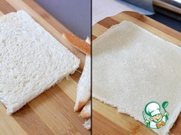 Срежьте с хлеба поджаристые края. Накройте ломтик пергаментом и раскатайте его скалкой в тонкий квадрат. Если есть на кухне ребристая скалка, то с её помощью можно будет придать характерный для вафель клетчатый рисунок. Если такой скалки нет, то подойдет и обычная гладкая скалка.