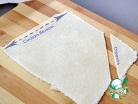 У полученного хлебного квадрата срежьте уголок. Для того, чтобы рожок не разворачивался при выпечке, смажьте край хлеба яичным белком.