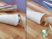 Совет. В таких вафельных рожках можно подать и сладкие десерты, например, мороженое. Растопите шоколад, налейте по одной чайной ложке шоколада внутрь хлебных конусов и распределите его ножом по стенкам. Дайте шоколаду застыть, а затем наполните сладкой начинкой.