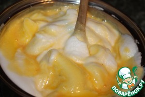 Добавляем к белково-желтковой смеси сухие ингредиенты, аккуратно перемешиваем.