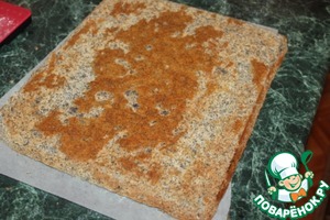 Расстилаем на стол чистый лист пекарской бумаги или полотенце и переворачиваем корж, дать ему немного остыть, аккуратно отделяем бумагу.