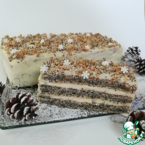 Пирожное очень красивое, вкусное, нежное и пушистое, как первый снег! Бисквитные маковые коржи с необычно-сливочным кремом, в котором чувствуется нотка лимона, прекрасное сочетание и дополнение к праздничному столу. Пирожное ещё можно приготовить заранее и заморозить, что в преддверии праздничной суеты очень удобно. Угощайтесь и наслаждайтесь!!!