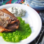 Сметану приправить очищенным и измельчённым хреном, посолить морской солью и поперчить. Огурцы нарезать вдоль. Извлечь рыбу из маринада.