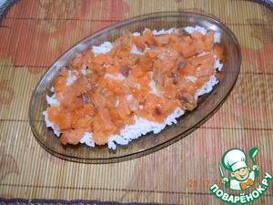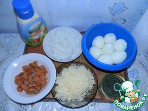 Берем такие ингредиенты. Рис отвариваем, семгу режем кубиками, яйцо и сыр пропускаем через мелкую терку..