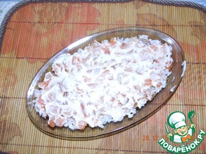Следующий слой - яйцо через терку и сыр, также через терку...