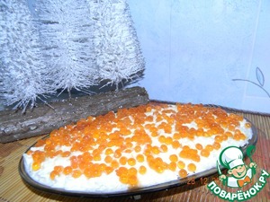 Намазываем майонезом и сверху красиво украшаем красной икрой..