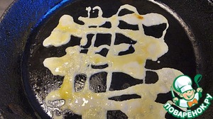 Разогреваем плоскую сковороду с антипригарным покрытием, выливаем 1 ст. л. масла и, отрезав уголок от пластикового пакета с яйцом, выливаем смесь на сковороду в виде решётки. подождите, пока яйцо свернется.