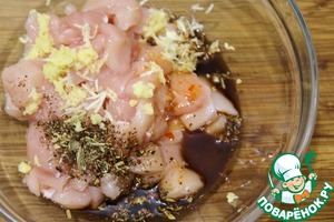 Куриное филе замариновать в 100г соевого соуса, добавив измельченные специи, мелко натертые имбирь и чеснок и (по желанию) перец чили (хлопья или свежий мелко нарезанный). Отставить филе мариноваться.