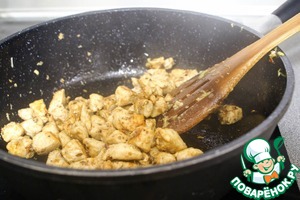 Сильно разогреть глубокую сковороду с одной ст. ложкой оливкового/кунжутного масла и быстро обжарить замаринованную курицу до корочки.
