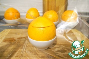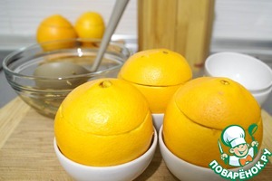 В это время подготовить апельсины: срезать с апельсинов "крышечки". Низ апельсина также немного подрезать для устойчивости. Выбрать из апельсинов мякоть с помощью ножа и ложки, оставляя немного мякоти на стенках. Немного мякоти важно сохранить, т. к., если останется только белый подкорковый слой, то в последствии он передаст блюду свою горечь.