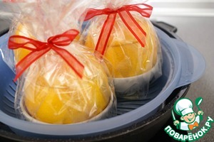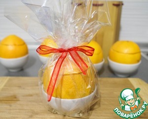 Также понадобятся кулинарные пакеты или целлофан, наподобие того, в который заворачивают цветы. В центр квадратного куска такого целлофана поставить пиалу с апельсином,