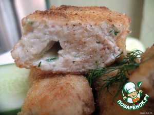 Обмакнуть во взбитое яйцо. Обвалять со всех сторон в сухарях и жарить с двух сторон на горячем масле по 2-3 минуты с каждой стороны (не прожариваю, только что схватилась корочка). Когда вся партия будет обжарена, уложить на противень и довести 10 минут в духовке при 200°С (или в МВ). Подавать, полив маслом со сковороды.