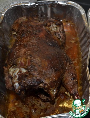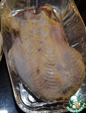 6. Поместить фазана в предварительно нагретую до 200 град. духовку и оставить запекаться на 70 мин. (через 35 мин. перевернуть, можно дополнительно полить небольшим количеством вина)