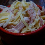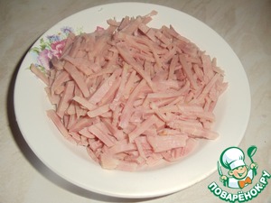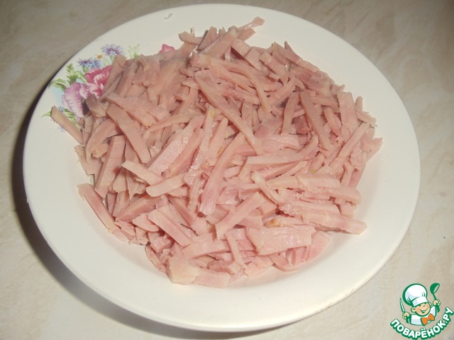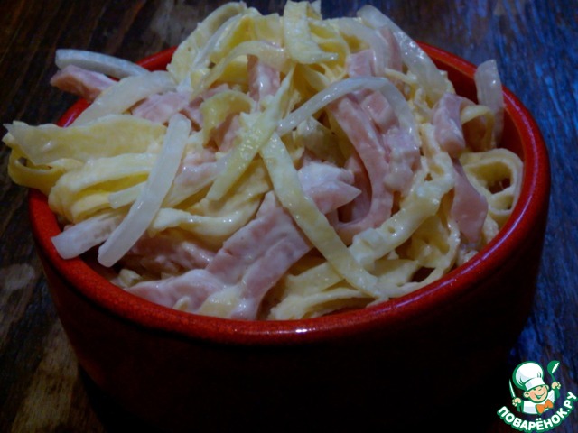Лук слить, переложить в салатник, добавить ветчину и блины. Осталось перемешать с майонезом. Вот и все, приятного аппетита!!!