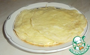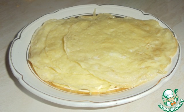 Яйца взбиваем с крахмалом и выпекаем тоненькие блинчики (у меня получилось 8 штучек)