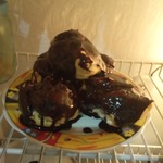 [+5]Из того, что сделала я :пекла на пергаментной бумаге, пропитанная силиконом,Qualita.Практически всю выпечку готовлю на ней, ничего не прилипает и не подгорает.Попробуйте.Крем поместила в пирожные при помощи кондитерского шприца. Ну и сварила шоколад и полила им пирожные сверху.