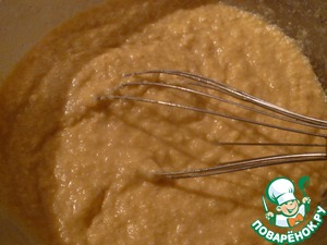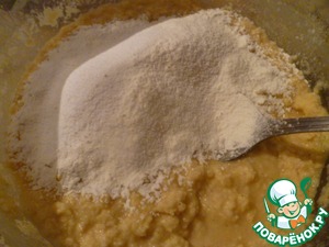 Теперь добавляем понемногу 1.5 стакана (250 мл) просеянной муки, смешанной с содой.