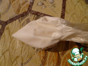 Для глазури я растерла 1/3 белка с 100 г сахарной пудры, переложила в файлик и сделала маленькую дырочку.