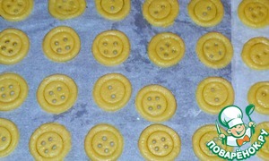 Получилось 70 пуговиц. Разложила их на два противня. Половину печенья смазала желтком, т. к., не все мои домашние едят яйца.