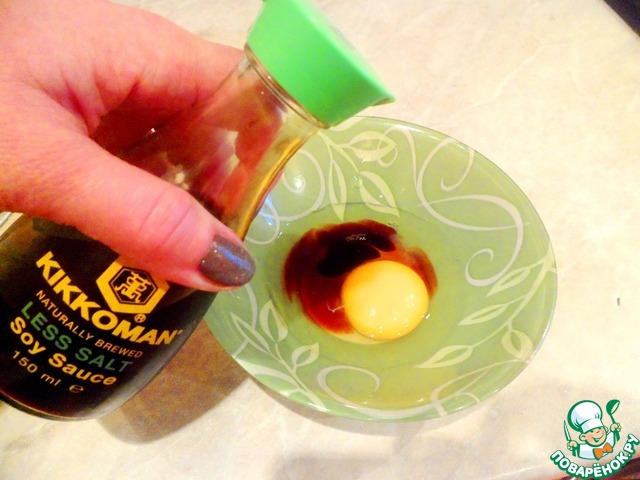 Яйцо смешать с 1 ч. л. соевого соуса компании Kikkoman. Это сочетание дает очень приятный грибной привкус.