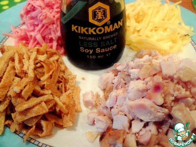 Натираем на крупной терке ветчину и сыр, нарезать мелкими кубиками вареную грудку, нарезать лапшой яичный блинчик.