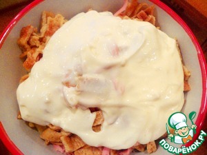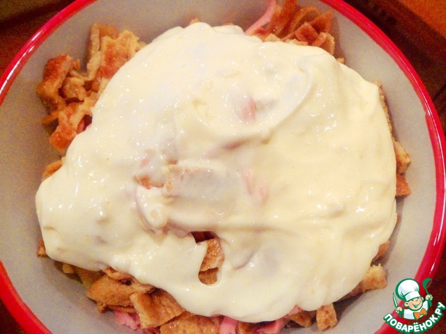 Майонез смешать с измельченным чесноком и перемешать со всеми подготовленными ингредиентами.