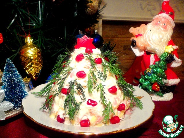 Украшаем веточками укропа, зернами граната и венчаем звездой из болгарского перца. Верхушку также можно вырезать из вареной моркови, а гранат заменить клюквой.