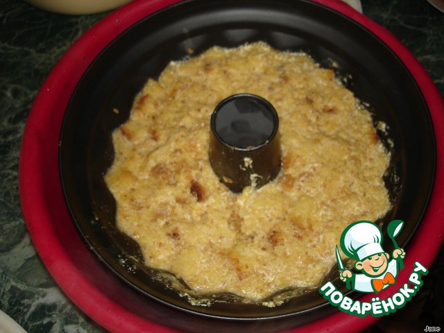 • Добавить кубики нарезанного коржа, перемешать. Выложить все в круглую форум (лучше всего в ту, которой вырезали круг из коржа, к примеру, в форму для кекса). Оставить застывать примерно 3 часа. Через 3 часа форму с заствшей желатиновой массой опустить в горячую воду.